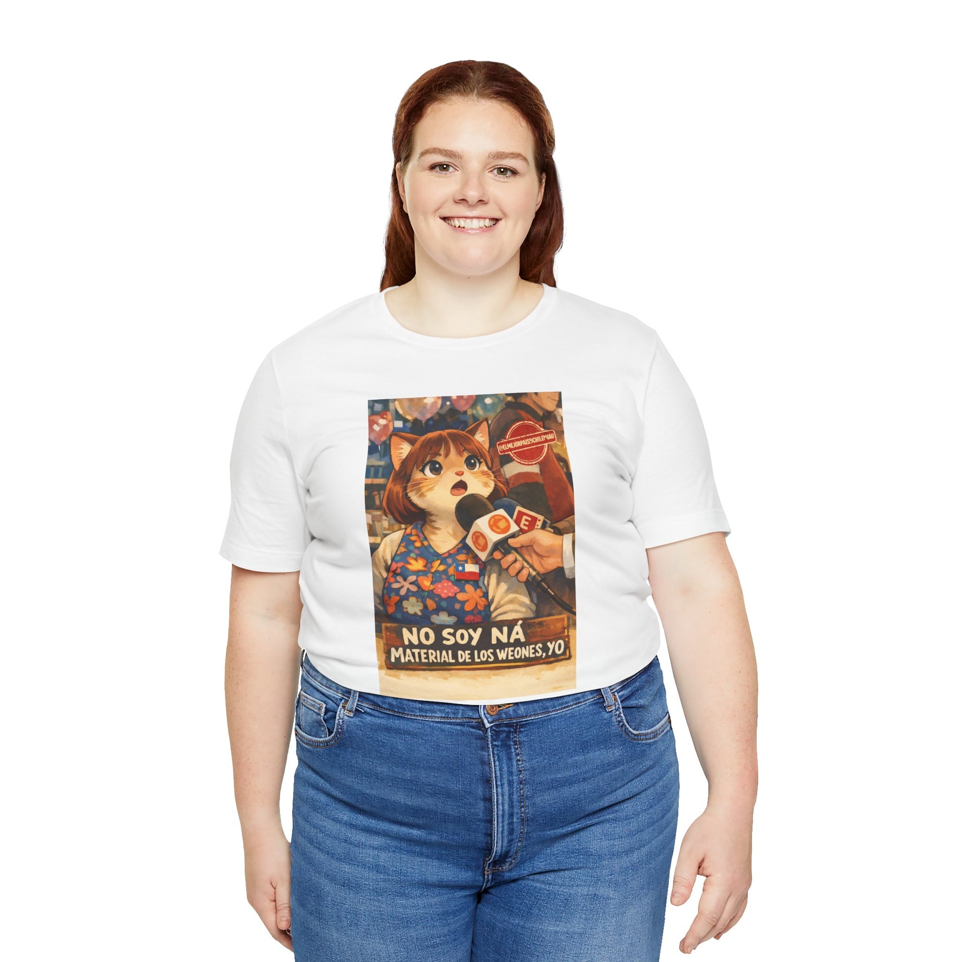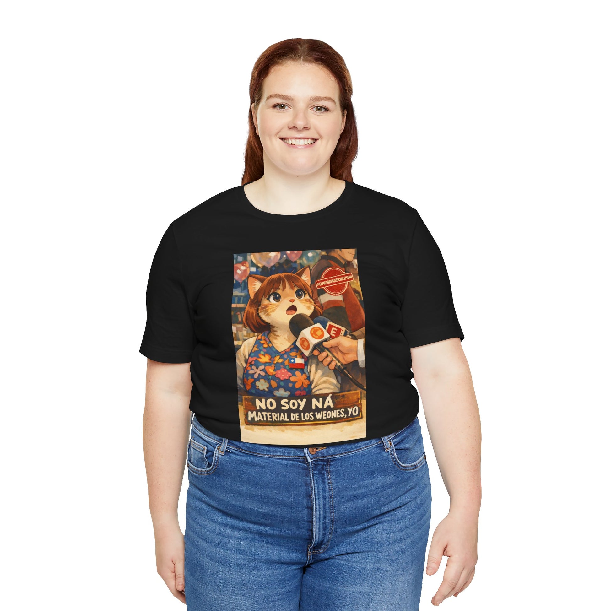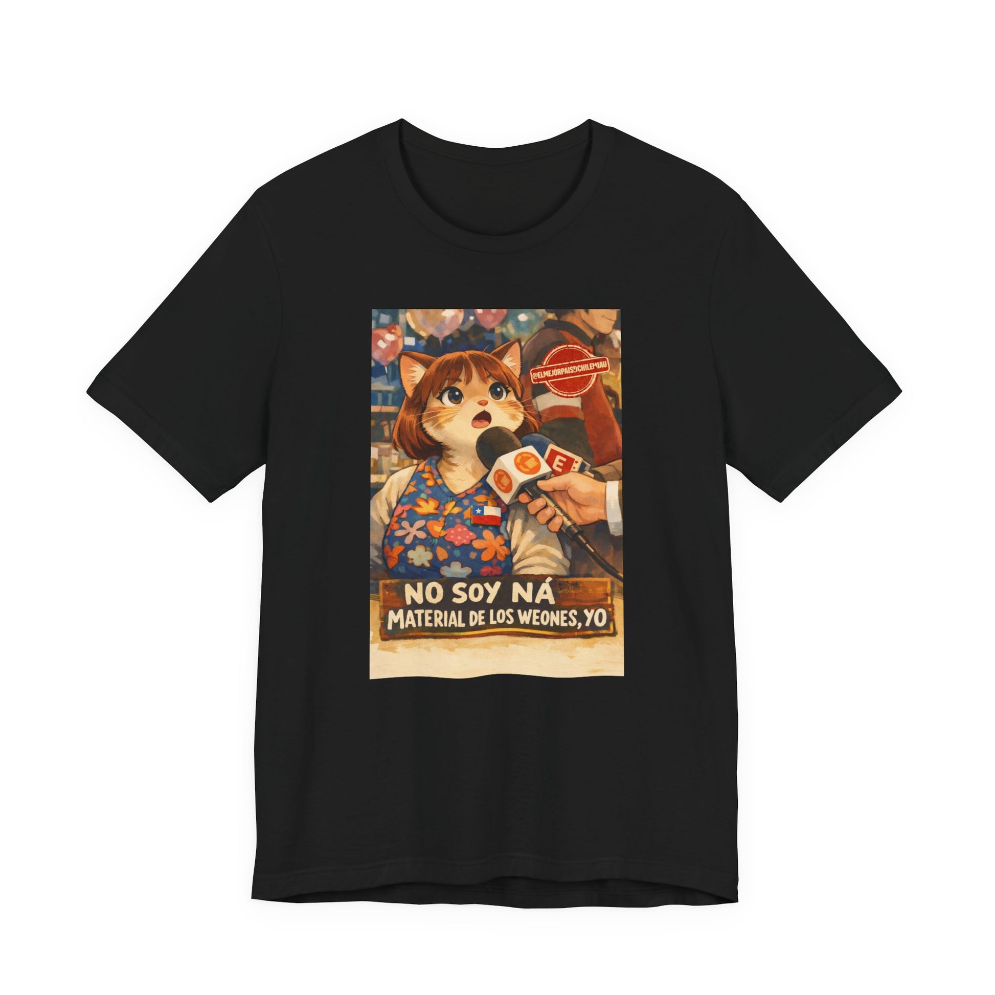 “No Soy Na Material de los Weones”, a bold expression born from everyday Chilean culture, representing self-respect, attitude, and raw humor.The phrase became a cultural meme and a symbol of setting boundaries with personality. The illustrated design adds a playful and modern twist, making it perfect for daily use.Ideal for those who appreciate Chilean culture, bold humor, and unique statement designs.The Bella Canvas 3001 is a classic unisex jersey short sleeve tee that fits like a well-loved favorite. Soft cotton and quality print make users fall in love with it over and over again. These t-shirts have ribbed knit collars to bolster shaping. The shoulders are tapered for a better fit over time, and dual side seams hold the garment's shape for longer..: Made with 100% Airlume combed and ring-spun cotton, the Bella Canvas 3001 is a lightweight fabric (4.2 oz/yd² (142 g/m²)) that's breathable and easy to layer. Perfect for active and leisure wear..: The retail fit that is perfect for casual and semi-formal settings. The crew neckline adds a classic, neat style that's perfect for accessorizing..: Bella+Canvas manufactures all its products in the US and internationally in humane, no-sweat-shop, sustainable way and is part of the Fair Labor Association as well as Platinum WRAP certified. .: The tear-away label minimizes skin irritations..: Fabric blends: Ash and Heather Prism colors - 99% cotton, 1% polyester; Heather and Solid Blend colors - 52% cotton, 48% polyester; Athletic Heather and Black Heather - 90% cotton, 10% polyester.